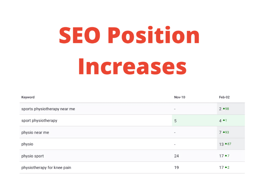 Check out these amazing keyword ranking jumps. In just a few short months, key search terms like “sports physiotherapy near me” and “physio near me” have soared into top positions—climbing by 98 and 93 spots respectively. 🌟