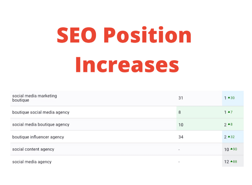 This is what real growth looks like. Multiple keywords have climbed dramatically in Google rankings — like “social media marketing boutique” jumping from position 31 to #1, and “social content agency” shooting up 90 spots. 🔥