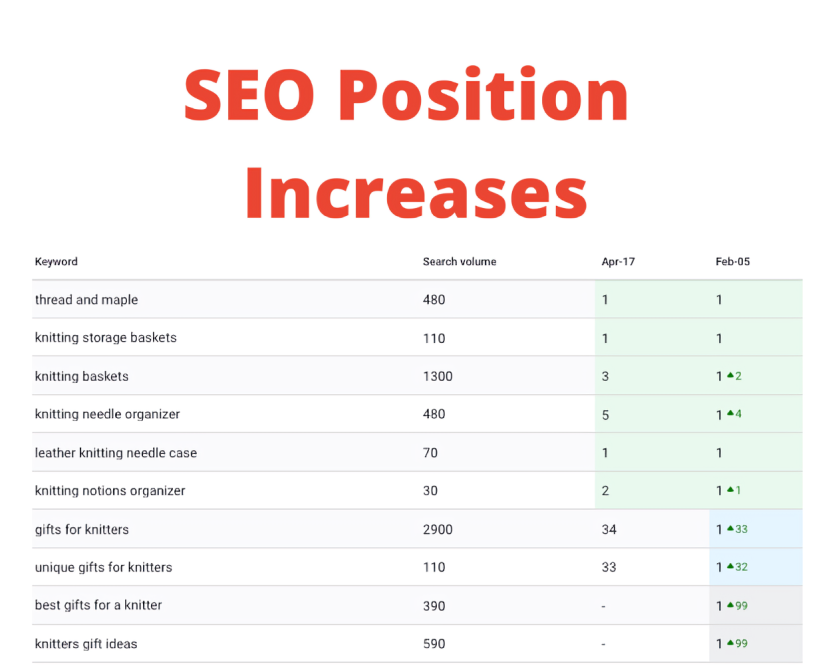 Even niche search terms like “knitting notions organizer” and “leather knitting needle case” are now ranking #1 — exactly where customers are searching.