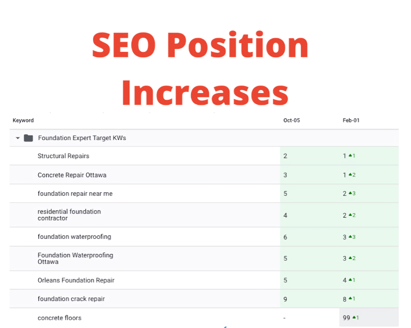 From “foundation repair near me” jumping from #5 to #2, to “concrete repair Ottawa” climbing to the top 2 spots, this business is now showing up right where customers are searching.