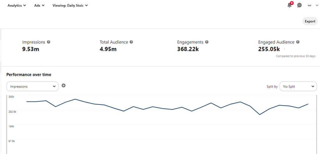 This dashboard gives a clear view of Daily Stoic’s reach and engagement over the past 30 days. With 9.53 million impressions, the content is being widely seen. The total audience stands at 4.95 million, showing strong visibility across platforms.