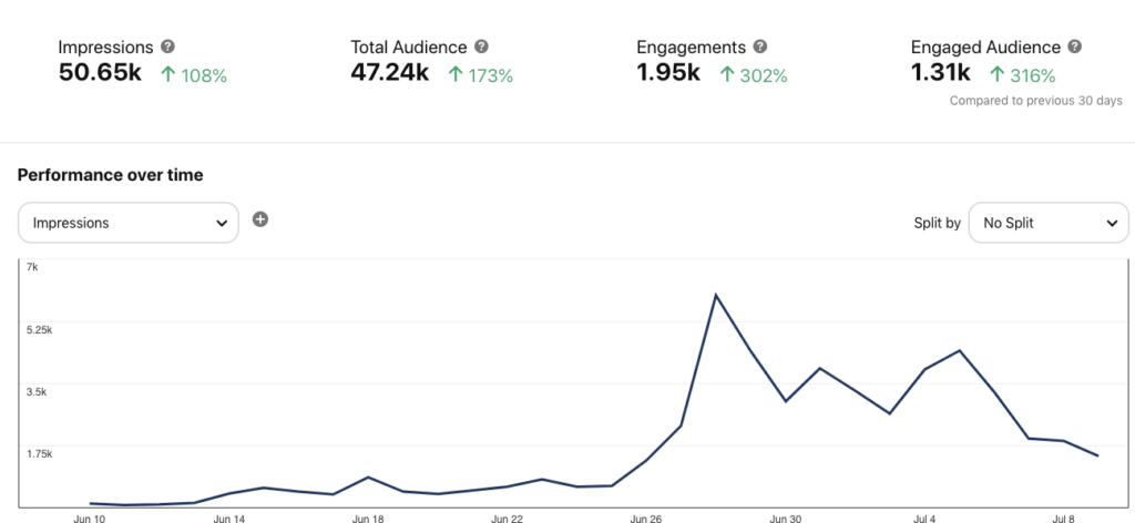 The chart reveals a clear surge in impressions around the end of June, followed by consistent interest into early July—proof that recent efforts are paying off.