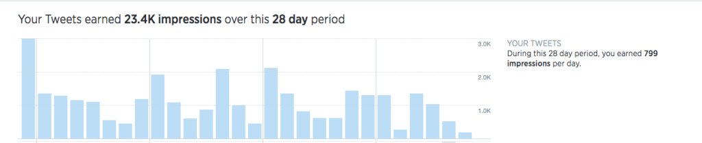 Over the last 28 days, your tweets pulled in an impressive 23.4K impressions, averaging 799 views per day. The bar chart highlights a steady stream of engagement, with several peaks showing strong days of visibility.